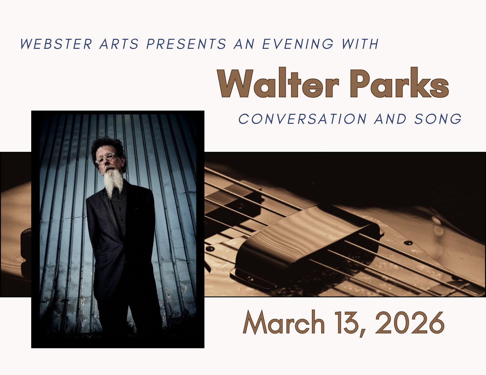 Webster Arts is pleased to welcome back Walter Parks! Join us on Friday, March 13, 2026 for a unique evening of conversation and song with one of the most unique and diverse musicians playing today. Walter presents historic and original music, toggling between swamp jazz, hollers, spirituals, Delta Blues, work songs, even operas. In between, learn about Walter’s approach to music and storytelling!